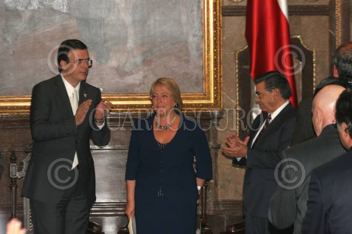 MÉXICO, D.F., 13AGOSTO2015.- Michellet Bachelet, presidenta de Chile, fue testigo de la firma del acuerdo "Fondo cooperación México Chile" entre José Antonio Meade Kuribreña, secretario de Relaciones Exteriores y Heraldo Muñoz Valenzuela, ministro de Relaciones Exteriores de Chile, realizada en el salón José María Morelos y Pavón de la Secretaría. En el evento, se entregaron reconocimiento a Raúl Valdez Aguilar, director general del Servicio Exterior, José Carreño Carlón, director del Fondo de Cultura Económica. FOTO: ADOLFO VLADIMIR /CUARTOSCURO.COM