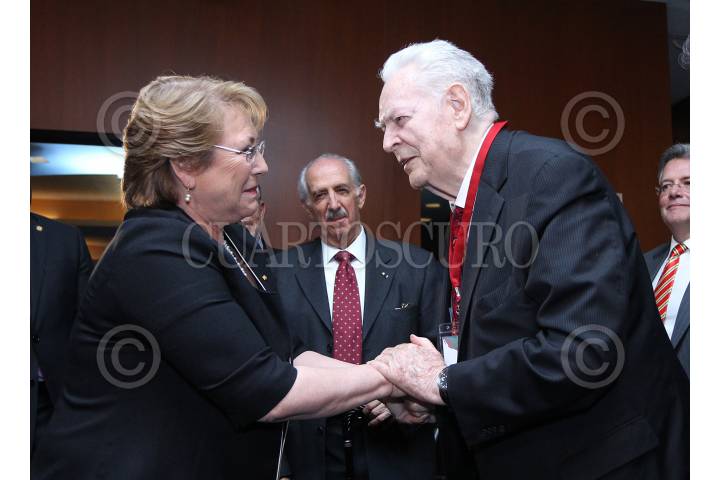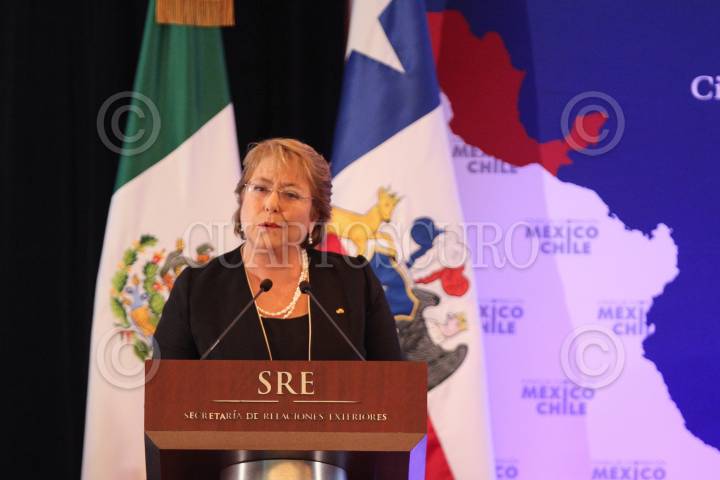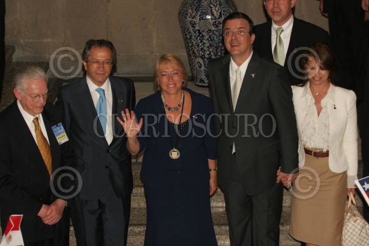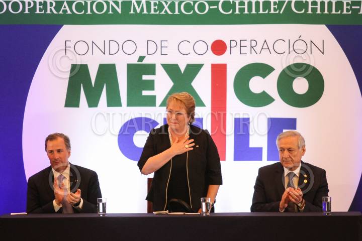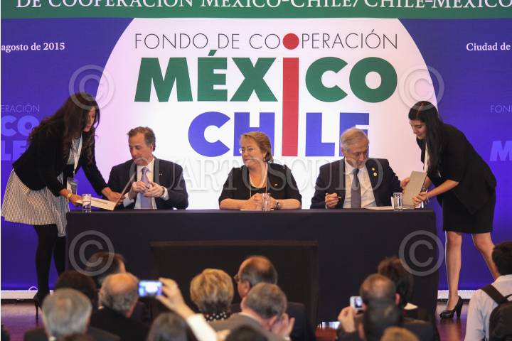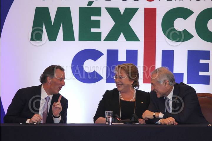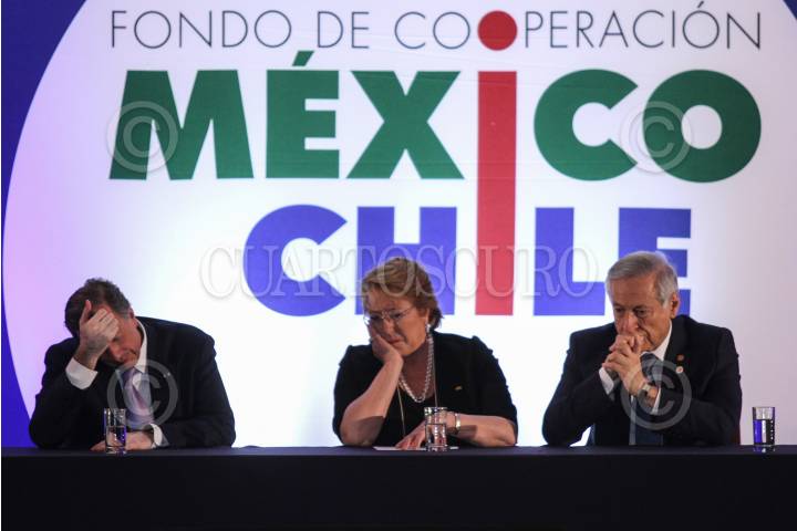 MÉXICO, D.F., 13AGOSTO2015.- Michellet Bachelet, presidenta de Chile, fue testigo de la firma del acuerdo "Fondo cooperación México Chile" entre José Antonio Meade Kuribreña, secretario de Relaciones Exteriores y Heraldo Muñoz Valenzuela, ministro de Relaciones Exteriores de Chile, realizada en el salón José María Morelos y Pavón de la Secretaría. En el evento, se entregaron reconocimiento a Gonzalo Martínez Corbalá, ex embajador de México en Chile en 1973, durante el asilo a cientos de chilenos en el inicio de la dictadura militar. FOTO: CUARTOSCURO.COM