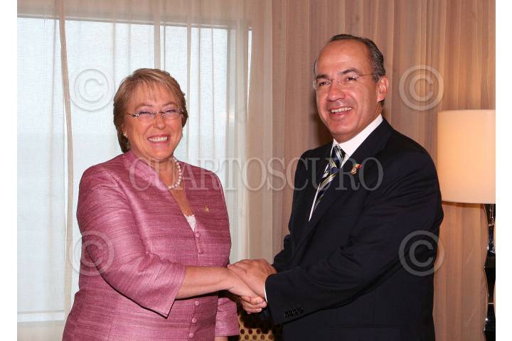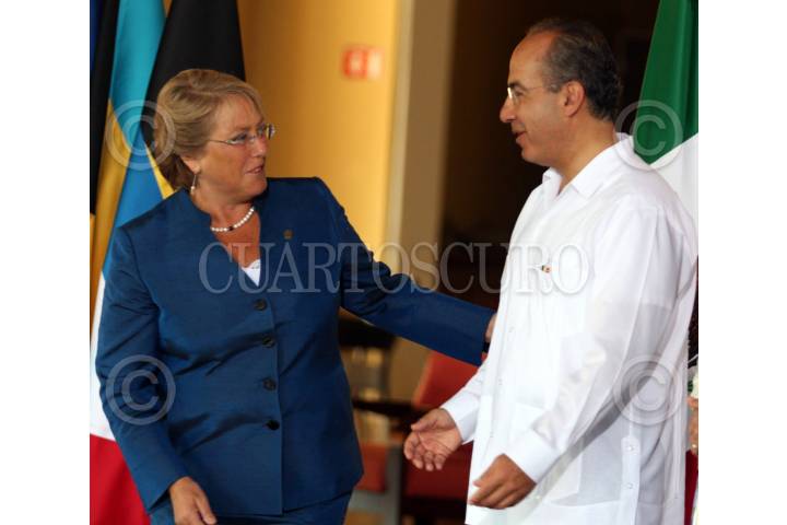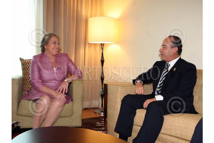 PUERTO ESPAÑA, TRINIDAD Y TOBAGO., 19 ABRIL2009.- La presidenta de Chile Michelle Bachelet y Felipe Calderon Hinojosa presidente de México en se reunieron en el marco de la quinta Cumbre de las Americas. FOTO ARIEL GUTIERREZ/CUARTOSCURO.COM