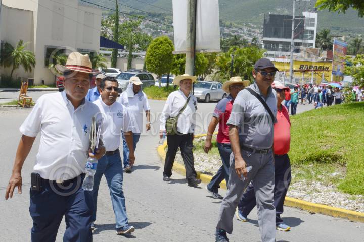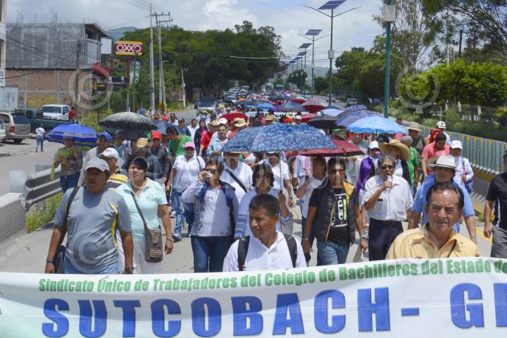 CHILPANCINGO, GUERRERO.23AGOSTO2017.- Integrantes del Sindicato Único de Trabajadores del Colegio de Bachilleres (SUTCOBACH) marcharon de la alameda Granados Maldonado hasta el Palacio de Gobierno de la entidad, para exigir sus derechos laborares, respeto al contrato colectivo y al pago de prestaciones en la nueva reforma educativa. La movilización la encabeza el secretario del Sindicato Alfredo Ramírez Bravo. FOTO: JOSÉ I. HERNÁNDEZ / CUARTOSCURO.COM
