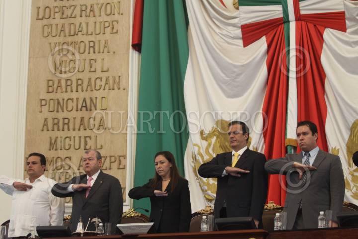 MÉXICO, D.F., 26ABRIL2011.- Edgar Elías Azar, presidente magistrado del Tribunal Superior de Justicia del DF, Roció Barrera Badillo, presidenta de la Mesa Directiva y Marcelo Ebrard Casaubón, Jefe de Gobierno, durante su participación en la sesión solemne para celebrar el 75 Aniversario del Instituto Politécnico Nacional en el pleno de la Asamblea Legislativa. FOTO: MOISÉS PABLO/CUARTOSCURO.COM