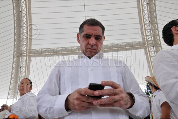 OAXACA, OAXACA, 01AGOSTO2011.- Gabino Cué Monteagudo, gobernador del Estado revisando sus mensajes en el celular durante un receso de la celebración de La Guelaguetza 2011 que deviene del Zapoteco y que significa Dar, regalar o compartir y que es considerada como la máxima fiesta de los Oaxaqueños y a la que asistieron más de 15 mil personas del estado y turistas. FOTO: PEDRO VALTIERRA/CUARTOSCURO.COM