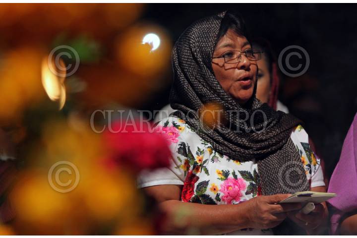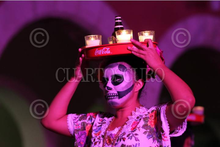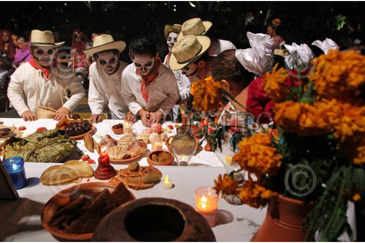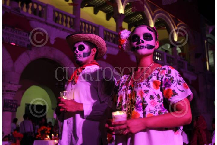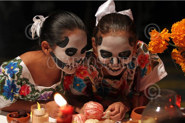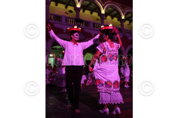 MERIDA, YUCATAN 30OCTUBRE2012.- “El baile de las ánimas” es un evento que se realiza en vísperas del día de muertos en la Entidad. En el espectáculo se ofrece una semblanza de las tradiciones del día de muertos en el Mayab; los bailes, los trajes típicos y las ofrendas. Los participantes vestidos con ropa típica de la región en este caso las mujeres con huipil y los hombres con guayabera y pantalón de manta, ambos con el rostro pintado de calaveras; realizan oraciones a las ánimas acompañados con música de una “serafina”, instrumento que hace años solía estar en las novenas yucatecas. Incienso, bailes regionales, flores, juegos y un gran altar adornan el ambiente para llevar acabo la representación de las ánimas y de esta manera dar la bienvenida a los fieles difuntos.. FOTO: FRANCISCO BALDERAS /CUARTOSCURO.COM
