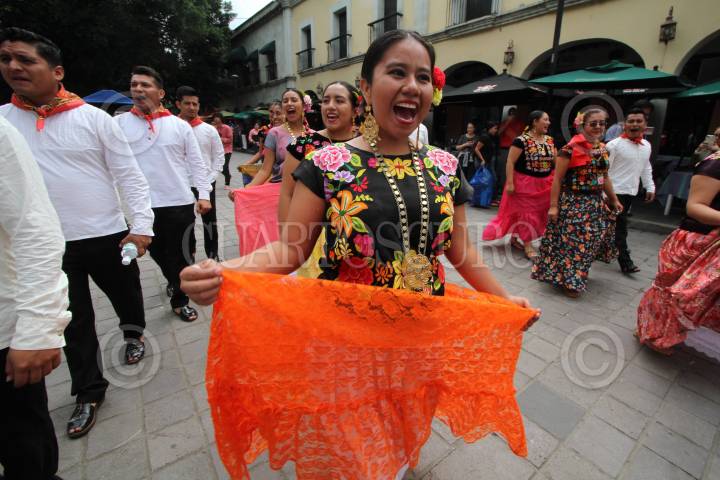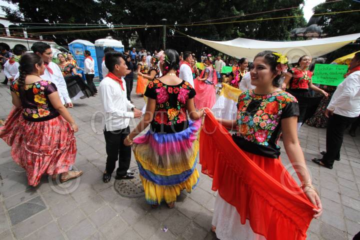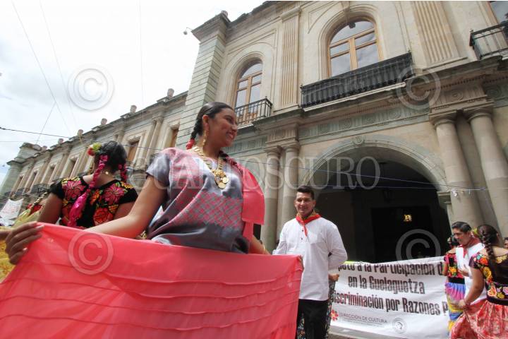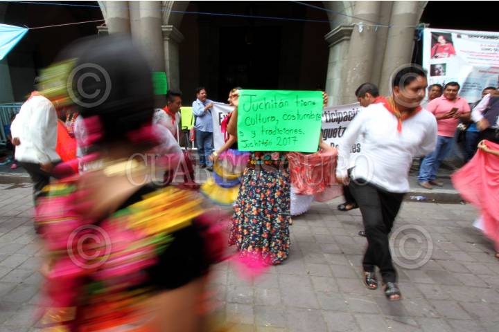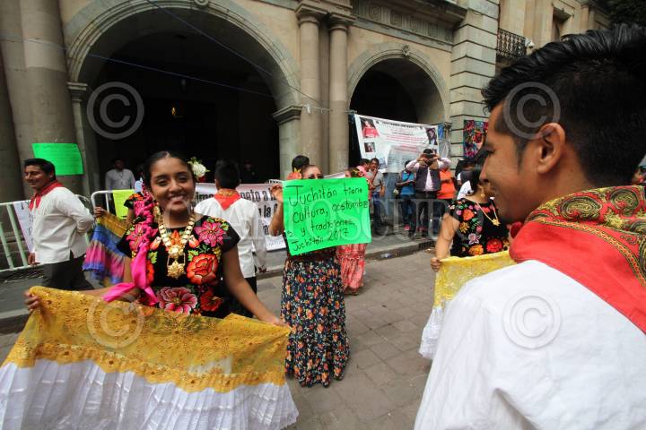 OAXACA, OAXACA, 07JULIO2017.- Integrantes del grupo folklórico de Juchitán de Zaragoza e integrantes de dicho ayuntamiento se manifestaron este viernes, luego de haberse enterado de que dicha delegación no fue tomada en cuenta para participar en las fiestas de la Guelaguetza a realizarse los lunes 17 y 24 de Julio. Los danzantes protestaron con bailables frente al palacio de gobierno, luego de una mesa de diálogo las autoridades estatales aceptaron su participación en la última edición del lunes del cerro. FOTO: ARTURO PÉREZ ALFONSO/ CUARTOSCURO.COM