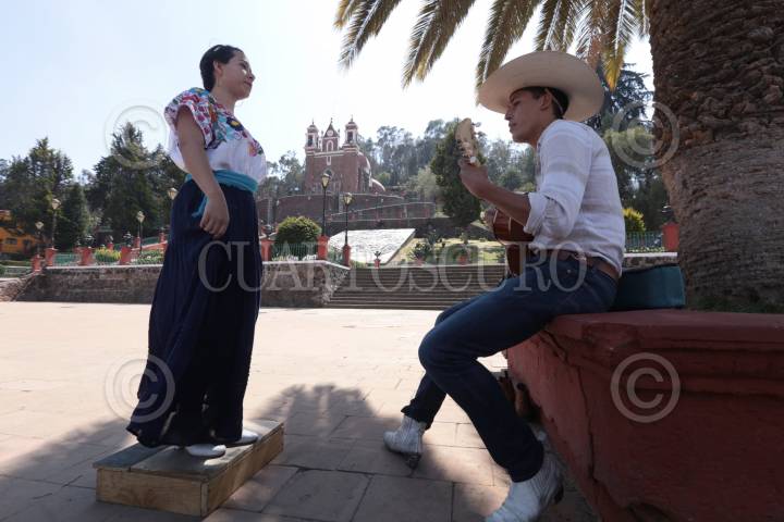METEPEC, ESTADO DE MÉXICO, 06FEBRERO2019.- Dos estudiantes de la escuela de Bellas Artes de Toluca practican en la explanada de la iglesia del Calvario en Metepec Son Jarocho y zapateado. FOTO: ARTEMIO GUERRA BAZ / CUARTOSCURO.COM