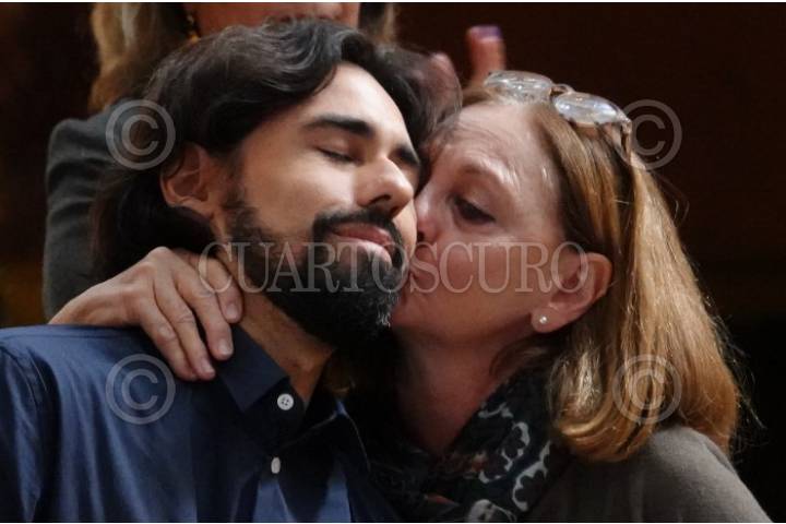 La esposa del bailarín Bernardo Benítez da un beso a su hijo, durante el Homenaje póstumo en Palacio de Bellas Artes