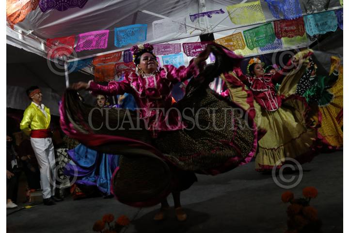Como parte de las actividades por el día de muertos danzantes de Nayarit caracterizados de catrinas y catrines realizaron baile regional en el quiosco de la Alameda Central.