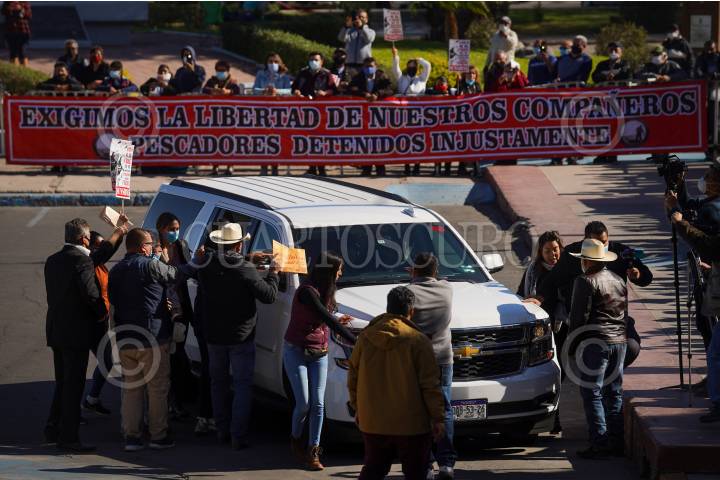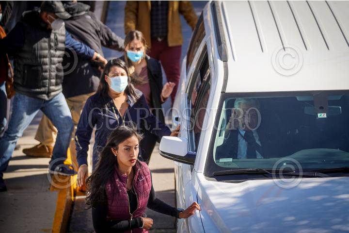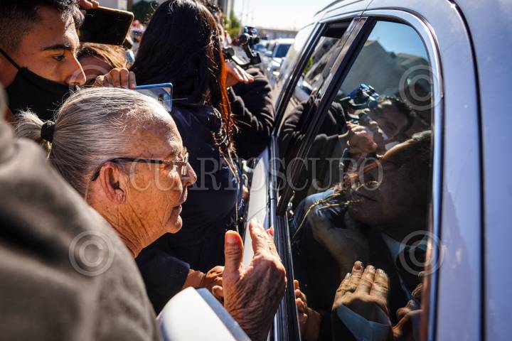 María Carolina Peña, madre del líder pescador de San Felipe Baja California Sunchine Rodríguez Peña detenido por la FGR buscó ser atendida por el Presidente a través del vidrio blindado de la camioneta donde se transportaba