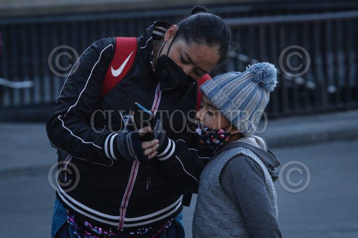 Dos mujeres abrigadas con chamarra para tratar de mitigar el frío de las primeras horas de este miércoles.