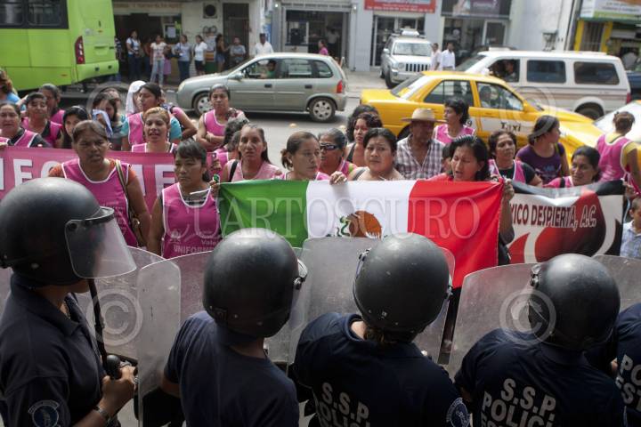 VILLAHERMOSA, TABASCO, 24ENERO2012.- Al menos un centenar y medio de mujeres de bajos recursos económicos de distintas rancherías y ejidos de Macuspana que representan el "Movimiento México Despierta A.C." buscando crear sus propias fuentes de empleo son reprimidas por un grupo de antimotines cuando por medio de la manifestación exigen la entrega del predio urbano de dos hectáreas que meses atrás debió ser entregado. Las amas de casa en su mayoría indígenas también piden ayuda económica en su paso a los automovilistas, y algunos infantes sufren de desmayo a falta de hambre y agua. FOTO: MARCO POLO GUZMÁN HERNÁNDEZ/CUARTOSCURO.COM