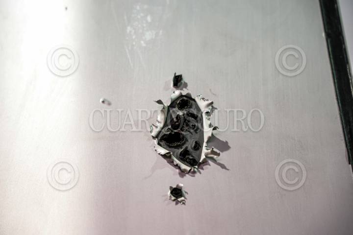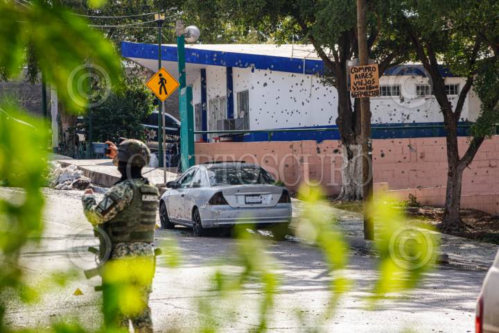 CULIACÁN, SINALOA, 08JUNIO2025.- Impactos de bala tras un enfrentamiento registrado en las inmediaciones de una gasolinera sobre el bulevar Agricultores, donde dos presuntos gatilleros fueron abatidos y cuatro personas resultaron víctimas colaterales. Elementos del Ejército acordonaron la zona luego de que testigos reportaran intensas detonaciones de arma de fuego. En el sitio, autoridades aseguraron armas largas, chalecos tácticos y municiones. También se encontraron rastros de sangre, casquillos percutidos y fragmentos de carrocería, los cuales fueron recolectados por personal militar como parte de la investigación en curso. FOTO: JOSÉ ZÁRATE/CUARTOSCURO.COM