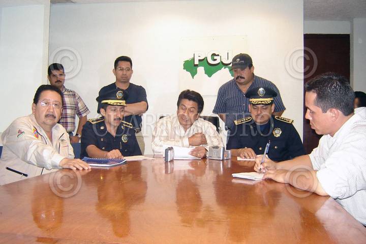 VILLAHERMOSA, TABASCO, 14NOVIEMBRE2005.- El procurador General de Justicia; Angel Mario Balcazar Martìnez (C) en rueda de prensa hablo sobre el modus operantis de la banda de secuestradores "Los Cañales", quienes operaban en la regiòn de la Chontalpa, donde tambien asaltaban en comercio, casa habitaciòn y robo de autos. FOTO: Marco Polo Guzmán/CUARTOSCURO.COM