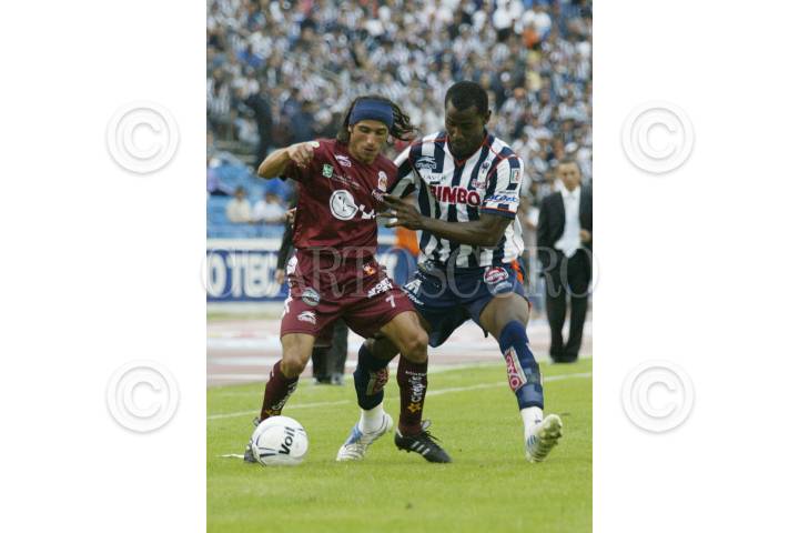 MONTERREY, NUEVO LEÓN 28ENERO2006.- Damián Alvarez (Morelia) pelea el balón con Felipe Baloy jugador (Monterrey) en el partido de la jornada 2 del torneo de clausura 2006 en el que Monterrey venció a monarcas Morelia 1-0 con gol del colombiano Hugo Rodallega. FOTO: Roberto Martínez/CUARTOSCURO.COM