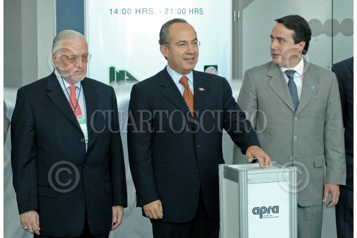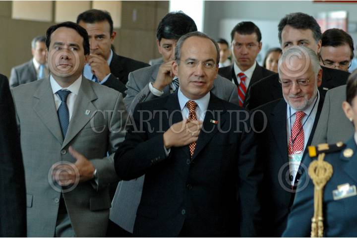 MÉXICO, D.F., 15JULIO2009.- Agustín Rios Matence, presidente ejecutivo de la industria nacional de autopartes; el presidente Felipe Calderón y Gerardo Ruiz Mateos, secretario de economía durante la inauguración de la exposición de autopartes "Paace Automechanika" que se realizo en el Centro Banamex. FOTO: RODOLFO ANGULO/CUARTOSCURO.COM