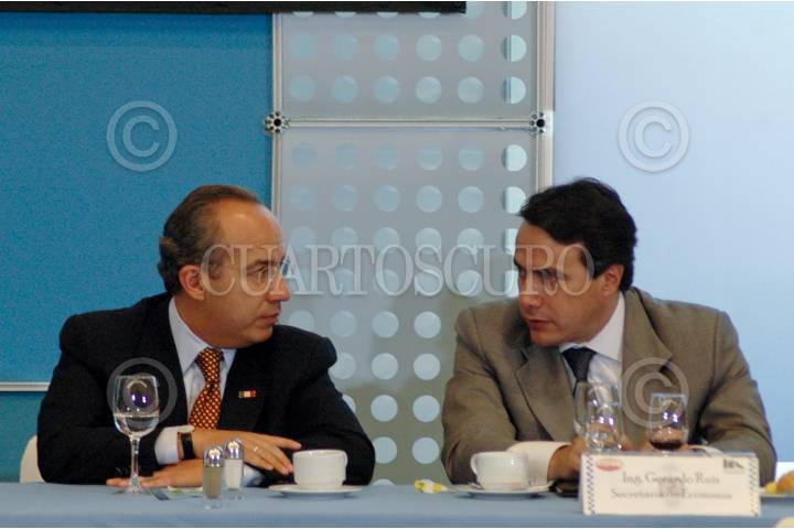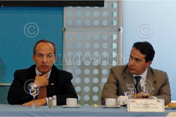 MÉXICO, D.F., 15JULIO2009.- El presidente Felipe Calderón y Gerardo Ruiz Mateos, secretario de economía; durante la comida de clausura del VII Congreso Internacional de la Industria Automotriz que se realizo en el Centro Banamex. FOTO: RODOLFO ANGULO/CUARTOSCURO.COM