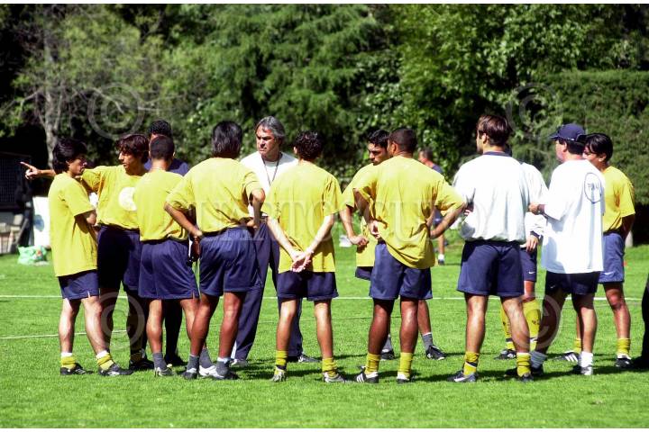 El doctor Miguel Mejía Barón, timonel de los Pumas de la UNAM, platica con sus jugadores poco antes de iniciar un partido interescuadras. FOTO: Pedro Mera/CUARTOSCURO.COM