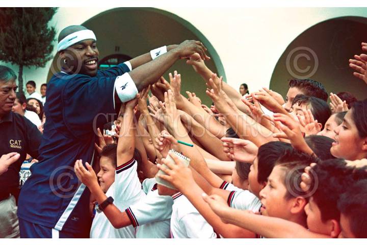 Los jugadores de la NBA Kenyon Martin de los Nets de Nueva Jersey y Baron Davis de los Hornets de Nueva Orleans, convivieron con estudiantes de la escuela primaria Benito Juárez, antes de empezar sus clínicas de juego. FOTO:Juan Sotelo/CUARTOSCURO.COM