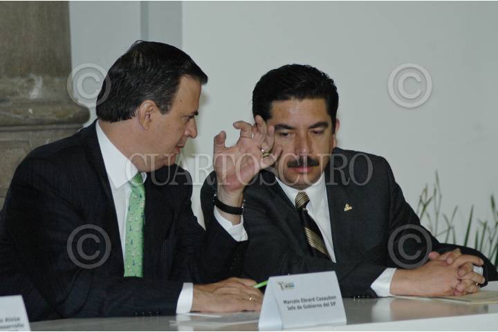 MÉXICO, D.F., 02JULIO2009.- Marcelo Ebrard Casaubon, jefe de gobierno del Distrito Federal conversa con Juan de Dios Barba Nava, presidente de la Coparmex - Ciudad de México durante durante la presentación del programa de apoyo económico para empresas que se realizo en el antiguo palacio del Ayuntamiento. FOTO: RODOLFO ANGULO/CUARTOSCURO.COM