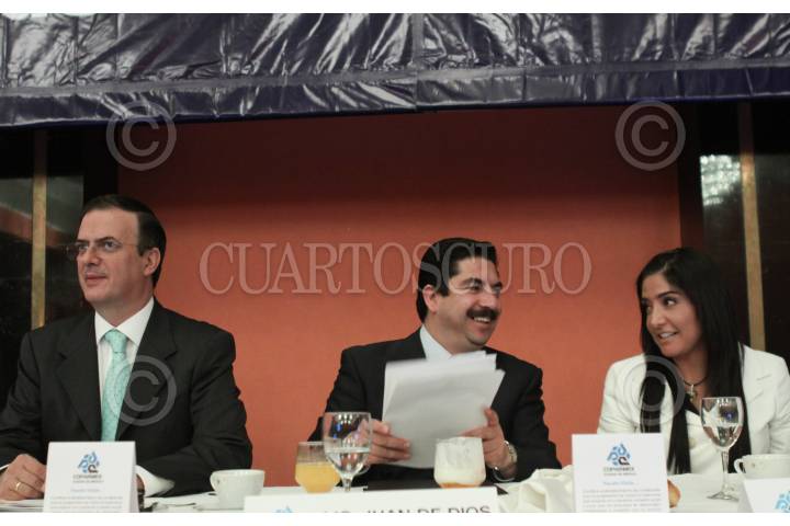 MÉXICO, D.F., 13JULIO2010.- Marcelo Ebrard Casaubón, jefe de gobierno, Juan de Dios Barba Nava, presidente de Coparmex Ciudad de México y Alejandra Barrales Magdaleno, presidenta de la Comisión de Gobierno de la Asamblea Legislativa, durante la Asamblea General de la Confederación Patronal de la República Mexicana. FOTO: MOISÉS PABLO/CUARTOSCURO.COM