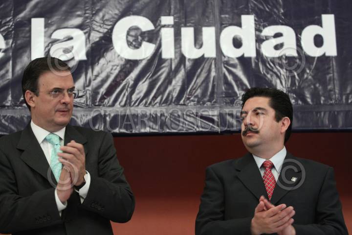 MÉXICO, D.F., 13JULIO2010.- Marcelo Ebrard Casaubón, Jefe de Gobierno y Juan de Dios Barba Nava, presidente de Coparmex Ciudad de México, durante la XXIII Asamblea General de la Confederación Patronal de la República Mexicana. FOTO: MOISÉS PABLO/CUARTOSCURO.COM