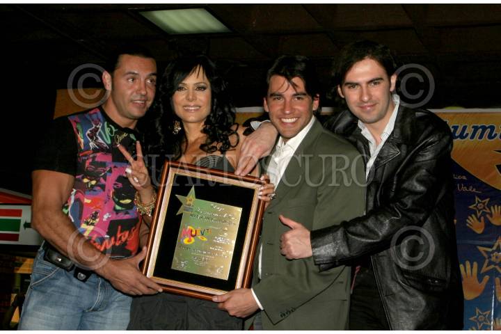 MÉXICO D.F. 23FEBRERO2007.- Los conductores del programa televisivo "Muevete" Latin Lover, Maribel Guardia, Mauricio Barcelata y el productor Roberto Romagnolly, muestran un reconocimiento otorgado en la plaza de las luminarias. FOTO: SAÚL LÓPEZ/CUARTOSCURO.COM