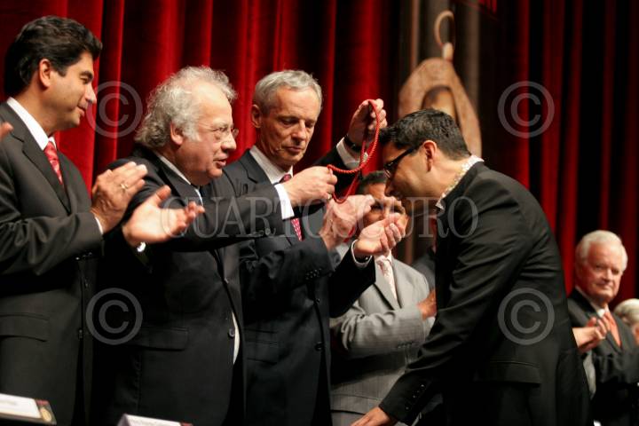 XALAPA, VERACRUZ, 14FEBRERO2009.- El músico, Victor Flores, recibió de manos de Fernando García Barna, rector de la Universidad Veracruzana, la medalla Mozart 2009, a la música académica, esta entrega se realizó en el Teatro del Estado, en el evento estuvo presente el gobernador de Veracruz Fidel Beltran. FOTO: RICARDO CASTELAN/CUARTOSCURO.COM