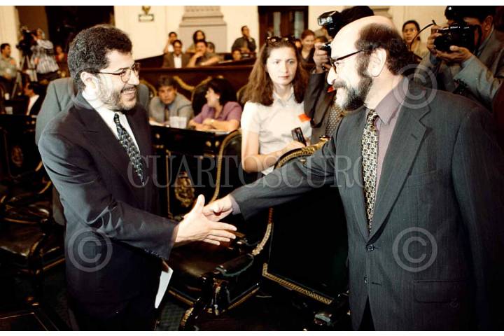 El presidente de la CDHDF Luis de la Barreda Solórzano pidió una vez más a la Procuraduría General de Justicia del D.F. la libertad de Paola Durante, presunta responsable del asesinato de Paco Stanley. Aqui Marti Batres acude a saludar a De la Barreda en su llegada.