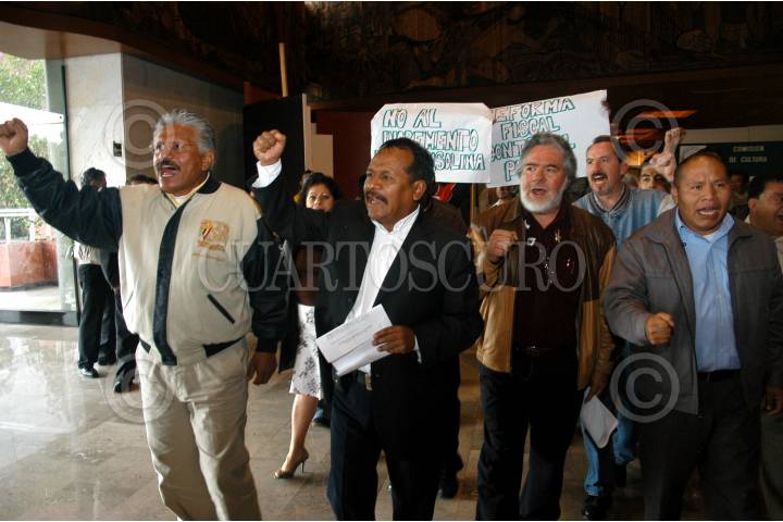 SAN LUIS POTOSI, 02FEBREO2007.- Manifestacion contra la empresa canadiense Minera San Xavier, filial de la trasnacional Metallica Resours. La cual conto con la participacion del Frente Amplio Opositor, Diputados Federales, locales, investigadores del Colegio de San Luis y simpatizantesdel movimiento De izq a der, El lider moral del FAO Mario Martinez, Los Diputados Federales Armando Barreiro y Silvano Garay, ambos inegrantes del Frente Amplio progresista ademas del enlace del gobernador Jesus Zarsosa. FOTO: ARON CADENA/CUARTOSCURO.COM