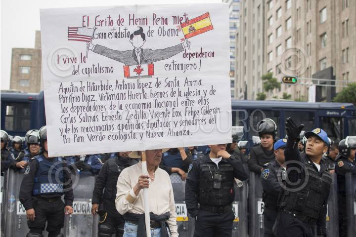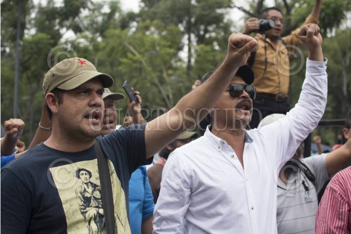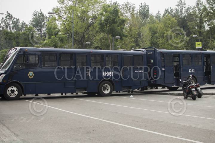 MÉXICO, D.F., 13SEPTIEMBRE2014.- Maestros miembros de la CNTE el día de hoy se manifestaron y marcharon rumbo al zócalo de la Ciudad de México, antes de cruzar Eje Central Lázaro Cárdenas una barrera de policías los detuvo y los obligo a desplegarse. FOTO: ISABEL MATEOS /CUARTOSCURO.COM