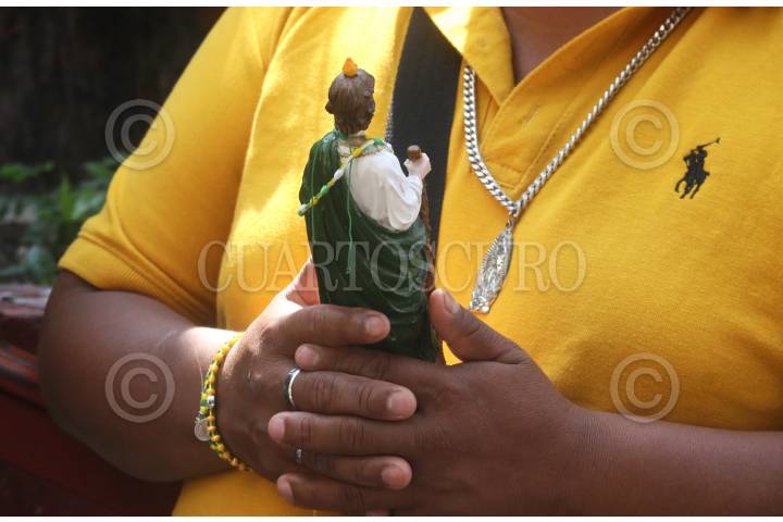 CUERNAVACA, MORELOS, 28OCTUBRE2024.- Un devoto de San Judas Tadeo, "Santo de las causas difíciles" acude a la misa que se celebra en su honor en la iglesia del barrio de Tepetates, en el centro de la ciudad. Hoy se celebra este santo que formo parte de los doce apóstoles, también referido como el "primo de Jesús" según la costumbre judía. En nuestro país San Judas Tadeo es uno de los santos mas venerado por su intervención para obtener ayuda divina en casos como búsqueda de empleo, matrimonios largos, curación de enfermedades, y todas aquellas "causas difíciles y desesperadas". FOTO: MARGARITO PÉREZ RETANA/CUARTOSCURO.COM