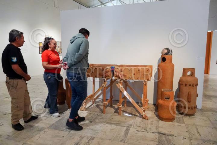 CIUDAD DE MÉXICO, 15MAYO2025.- Personas observan las piezas del artista plástico Alfonso Zarate durante el recorrido a medios de la exposición “Desde el corazón del Barrio. Tepito raíces profundas, voces que resuenan”, muestra colectiva que reúne a más de veinte artistas que viven, crean o mantienen vínculos estrechos con el barrio de Tepito y que podrá ser visitada en la Galería José María Velasco (GJMV), colonia Peralvillo, alcaldía Cuauhtémoc. FOTO: GALO CAÑAS/CUARTOSCURO.COM