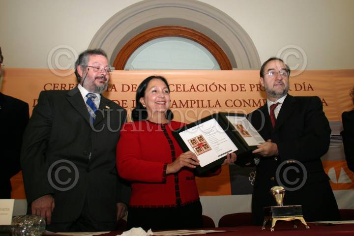 MÉXICO, D.F., 03OCTUBRE2007.- Jesús Flores Barroeta, Presidente de la Sociedad Filatélica de Zacatecas, Amalia García Medina, gobernadora de Zacatecas y Alfonso de María, director general del INAH, durante la ceremonia de cancelación de primer día de emisión de la estampilla conmemorativa "Arte Sacro Virreinal" en el alcazar del Castillo de Chapultepec. FOTO: MOISÉS PABLO/CUARTOSCURO.COM