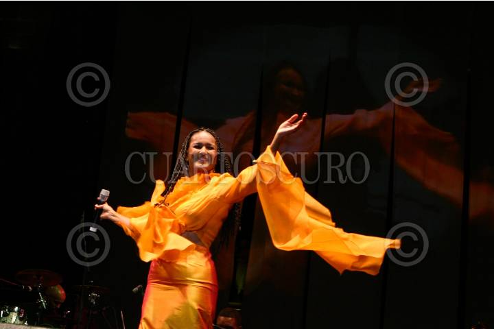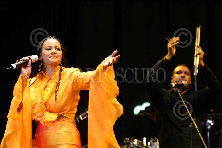 PUEBLA, PUEBLA, 20NOVIEMBRE2008.- La cantante María de Barros de Cabo Verde, África y del sello disquero Putumayo se presento esta noche en el zócalo de esta ciudad en la edición 10 del Festival Internacional de Puebla que ese fin de semana llega a su fin después de dos semanas de eventos culturales, artísticos y musicales. FOTO: RODOLFO ANGULO/CUARTOSCURO.COM