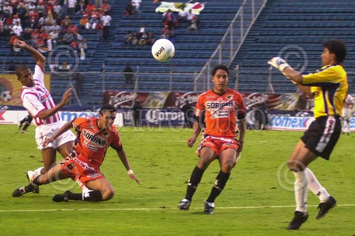 Flavio Barros, del equipo Necaxa, venca al defensa Pedro Sarabia, de los Jaguares, en el encuentro que sostuvieron hoy en el Estadio Azul, dentro de la jornada 6 del torneo de apertura 2002. FOTO: Juan Pablo Zamora/CUARTOSCURO.COM