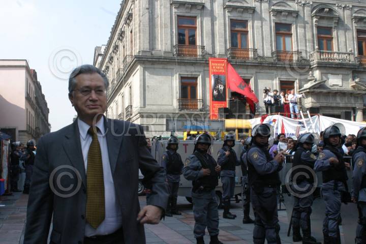 México, D.F. 28 JULIO 2004. - El senador priísta Manuel Bartlet, a su llegada al senado que se encontraba rodeado por trabajadores del IMSS y de integrantes del FPFV. FOTO: Sandra Perdomo/CUARTOSCURO.COM