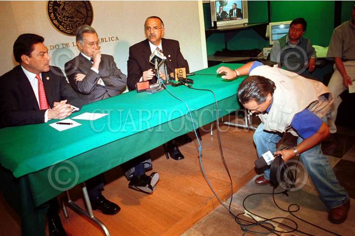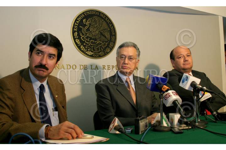 MEXICO, D.F., 06ABRIL2006.- Los senadores Javier Corral , Manuel Bartlet y Cesar Raúl Ojeda, ofrecieron una conferencia de prensa sobre la reciente aprobación de la Ley de Radio y Televisión o llamada Ley Televisa, en el Senado de la República. FOTO: Moisés Pablo/CUARTOSCURO.COM