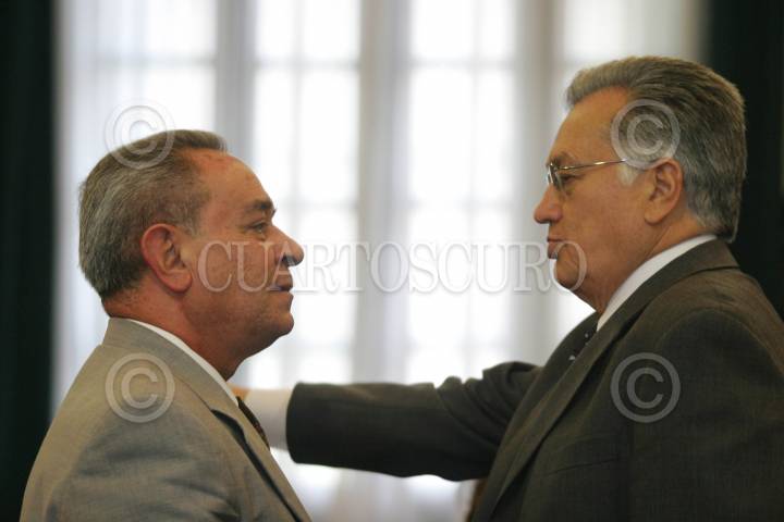 MÉXICO D.F. 10SEPTIEMBRE2007.-Manuel Bartlet ex-senador por el PRI saluda a Javier González Garza coordinador de la bancada del PRD durante la inauguración del Congreso Nacional de Radios Indigenas, en las instalaciones de la Cámara de Diputados. FOTO: GUILLERMO PEREA/CUARTOSCURO.COM