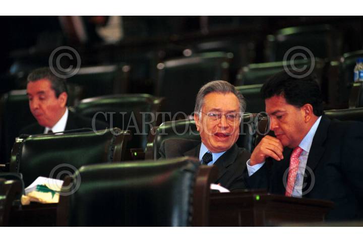 Humberto Roque Villanueva en su lugar, mientras Manuel Bartlett y Ricardo Aldana, también legisladores priístas conversan en la sesión de la Cámara Alta, esta mañana. FOTO: Victoria Valtierra/CUARTOSCURO.COM