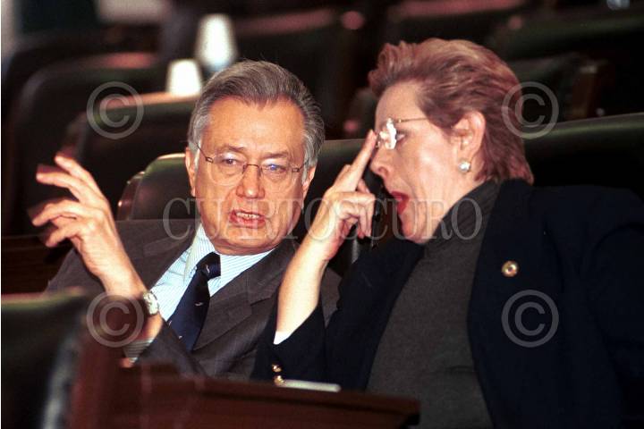 Los legisladores priístas Manuel Bartlett y Laura Alicia Garza Galindo conversan durante la sesión en la Cámara de Senadores. FOTO: Christian Palma/CUARTOSCURO.COM