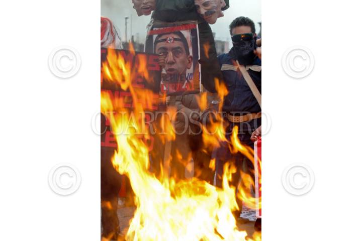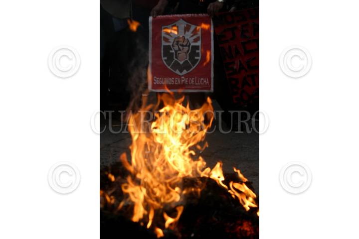 MÉXICO, D.F., 29ENERO2010.- Integrantes del Sindicato Mexicano de Electricistas (SME) que marcharon del Ángel de la Independencia quemaron muñecos en la explanada del Zócalo como protesta a las políticas económicas y sociales del gobierno las cuales han generado desempleo y pobreza y el incremento de precios a productos básicos y combustibles. FOTO: RODOLFO ANGULO/CUARTOSCURO.COM