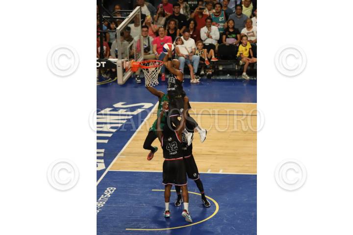 Los basquetbolistas Walter Hodge del equipo Amigos de Ayón y Fabián Jaimes de la Selección Mexicana, disputan un balón, esto durante el juego de despedida de Gustavo Ayón, en la Arena Astros.