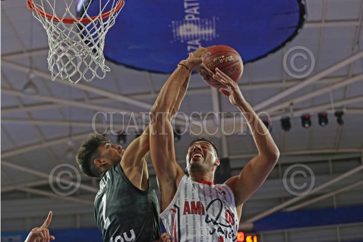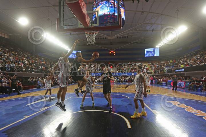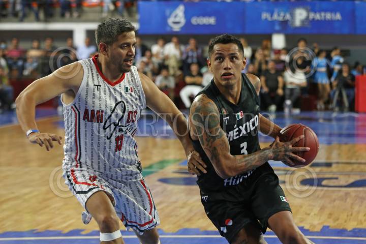 Los basquetbolistas Fabián Jaimes de la Selección Mexicana y Cesar Everardo de Amigos de Ayón, disputan un balón, esto durante el juego de despedida de Gustavo Ayón, en la Arena Astros.