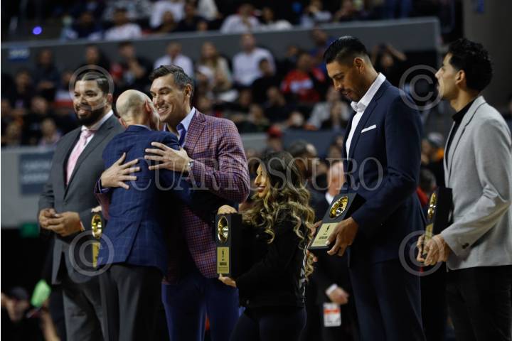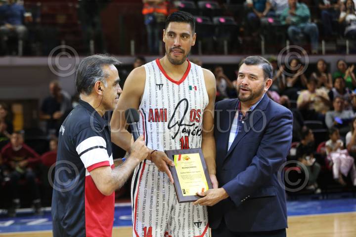 El presidente de la Federación Mexicana de Basquetbol, realiza la entrega de un reconocimiento al basquetbolistas Gustavo Ayón, esto durante el juego de despedida de Gustavo Ayón, en la Arena Astros.