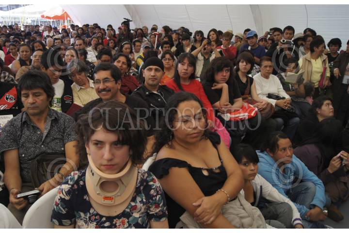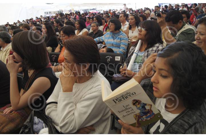 MÉXICO, D.F., 23OCTUBRE2011.- Visitantes a la Feria Internacional del Libro del Zócalo, acudieron a la lectura que realizaron al libro de José Emilio Pacheco “Batallas en el Desierto”. FOTO: PEDRO VALTIERRA/CUARTOSCURO.COM
