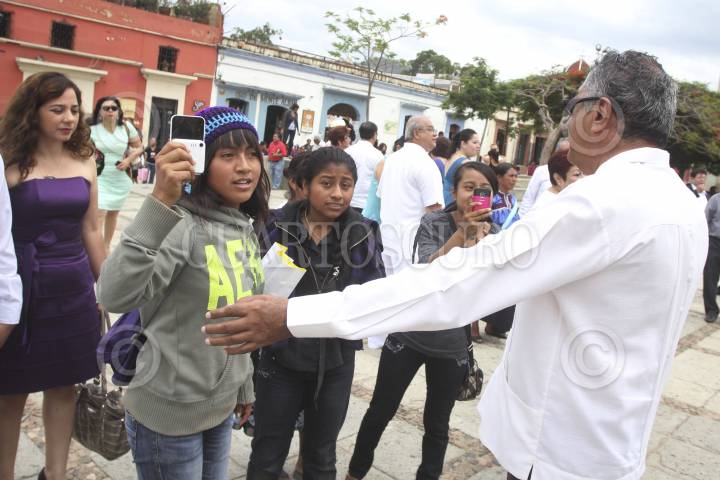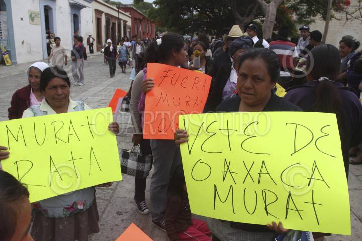 OAXACA, OAXACA, 25MAYO2013.- Indígenas zapotecas provenientes de la región del Istmo de Tehuantepec se manifestaron en el atrio del ex Convento de Santo Domingo de Guzmán en la ciudad de Oaxaca en contra del ex gobernador de Oaxaca y actual coordinador Ejecutivo del Consejo Rector del Pacto por México, José Murat Casab. En el templo se llevó a cabo el bautizo y primera comunión de sus nietas Ivette, Alexa, Emilia Murat Morán. Juan Díaz Pimentel, ex secretario de Salud en la administración de Murat Casab (1998 - 2004) ofreció 10 mil pesos en efectivo a las manifestantes para retirarse. FOTO: ARTURO PÉREZ ALFONSO /CUARTOSCURO.COM