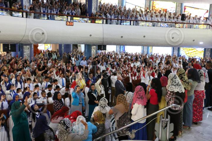 CIUDAD DE MÉXICO, 23JUNIO2019.- La trade de este domingo cerca se 4 mil fieles se dieron cita en el Templo de la La Luz del Mundo para oficiar la misa de bautismo encabezada por Miguel Gonzales, Pastor de la iglesia de poco más de 200 personas. Esto pese a las más de 20 acusaciones sexuales que tiene su aún líder Naasón Joaquín Garcia, los cuales enfrenta en los Estados Unidos. FOTO: ROGELIO MORALES /CUARTOSCURO.COM
