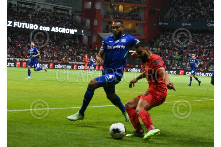 Pedro Alexis Canelo jugador de los Diablos de Toluca y Jonathan Tah de Bayer 04 Leverkusen durante el encuentro amistoso en el estadio Nemesio Diez.
