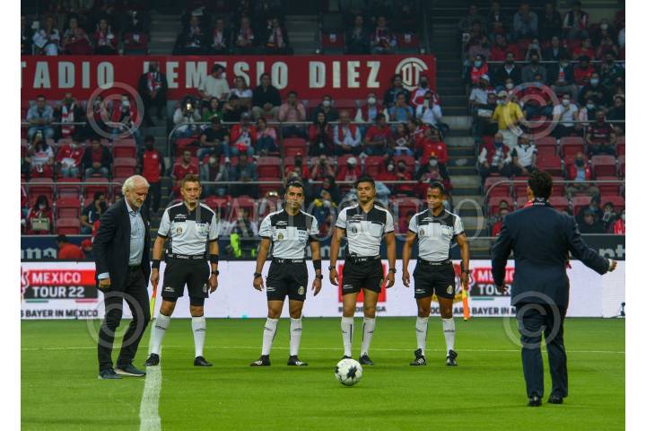 Rudi Völler ex fugado y leyenda del fútbol Alemán dio la pata inicial en el encuentro entre los Diablos del Toluca y el Bayer 04 Leverkusen en el duelo amistoso celebrado en el estadio Nemesio Diez.