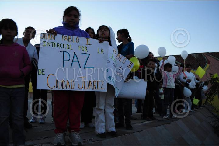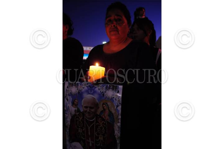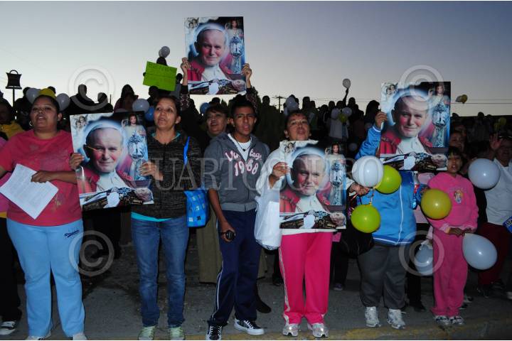 CIUDAD JUÁREZ, CHIHUAHUA, 16NOVIEMBRE2011.- En valla a ambos costados de principales vialidades, miles de juarenses esperaron y presenciaron el paso de la caravana vaticana con las reliquias de Juan Pablo Segundo. Para tomar fotos, para tocar el automotor con una reproducción de la figura del extinto pontífice beatificado el anterior 01 de mayo -a seis años de su fallecimiento el 02 abril de 2005-, los fronterizos salieron al paso de la comitiva, e incluso muchos la siguieron desde su arranque a las 16:30 a la altura del kilómetro 20 sobre la carretera Casas Grandes. Con globos blancos y amarillos en las manos, los files católicos vieron pasar las reliquias papales por Eje Vial Juan Gabriel, avenida de los Aztecas, Bulevar Zaragoza, perimetral Carlos Amaya y Belisario Domínguez. FOTO: NACHO RUÍZ/CUARTOSCURO.COM