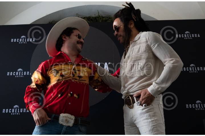 El productor de sotol Ricardo Pico, y el cantante Lenny Kravitz posan tras la conferencia en que presentó su marca de Sotol "NocheLuna" en el Hotel Four Seasons de Reforma.